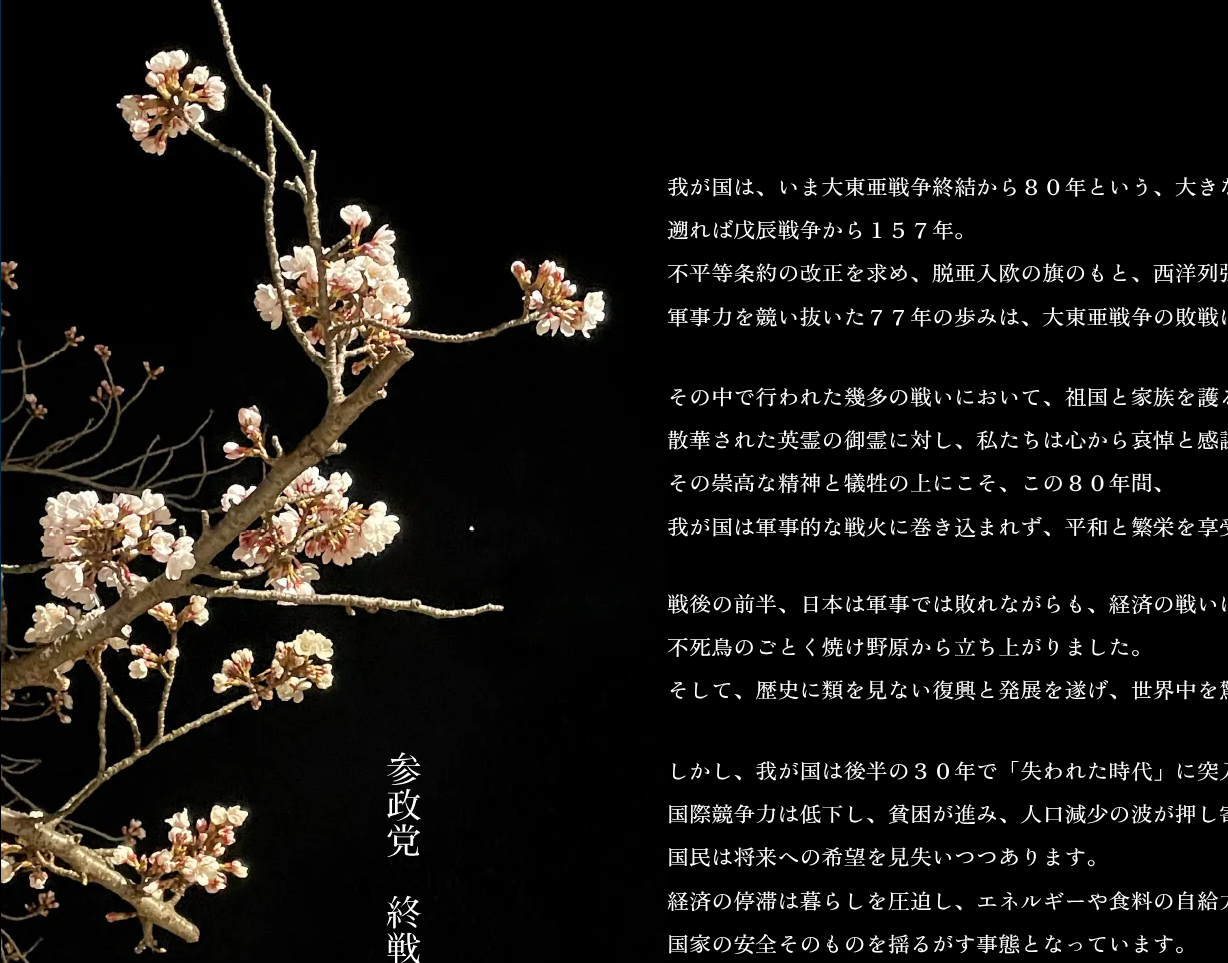 いまこそ、近代化以降の歩みと戦後80年を、光と影の双方から学び直すべき時です。二度と国民を戦禍にさらさず、国際社会の相互依存と競争の中で持続可能な繁栄を実現し、先人が築いた「日本」を未来へとつなぐ――それが、いまを生きる私たちの責務です。