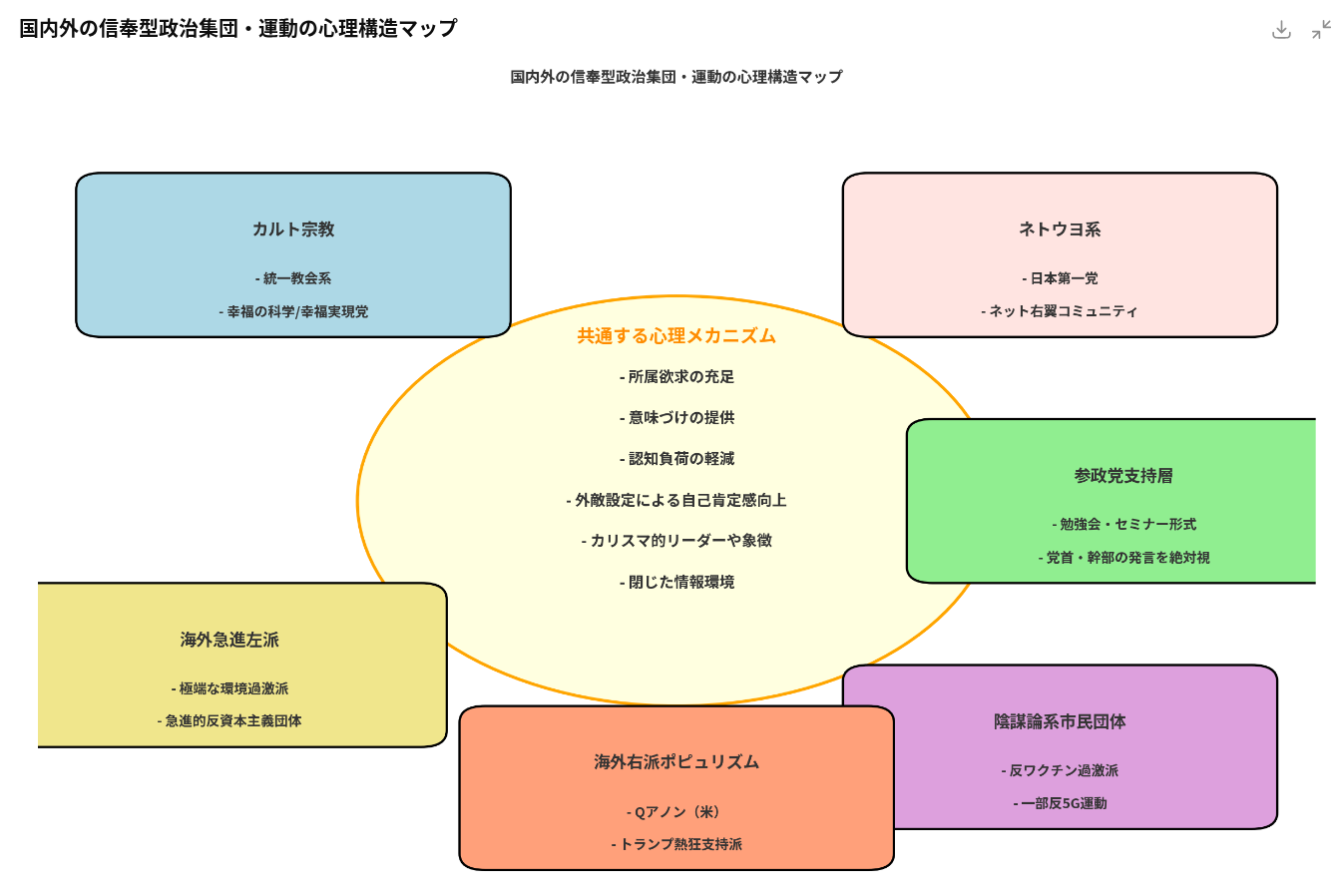 これらの条件がそろうと、右翼・左翼・宗教・市民団体といったジャンルを問わず、心理的には同じ「信奉型政治集団」として機能するようになります。