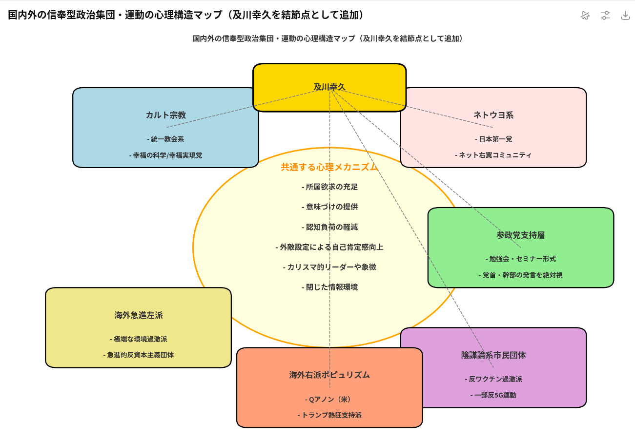 この構造で見ると、及川氏は単なる情報発信者ではなく、複数の信奉型政治集団を横断的につなぐ「ハブ的カリスマ」と位置づけられます。そのため、彼を介して異なる運動の参加者が同じ物語を共有しやすくなっています。