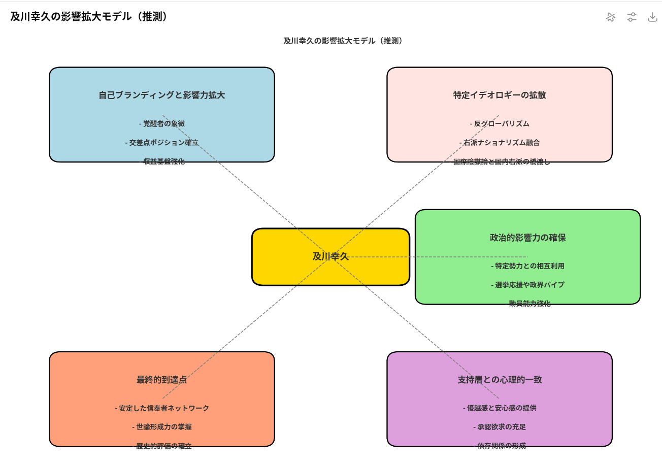 • 及川の狙いは、自身のカリスマ性を強化しつつ政治・宗教・陰謀論市場のハイブリッド支持層を構築し、世論や動員を左右できる地位を確保することにあると推測される。