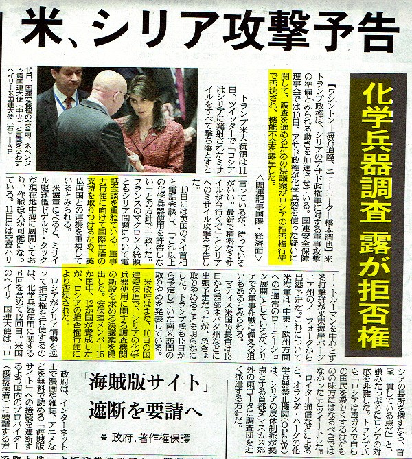さて、この紙面では、こうあります、「トランプ大統領は」「軍事力行使に向けて国際世論の支持を取り付けるため、英仏両国との連携を重視しているとみられる」。