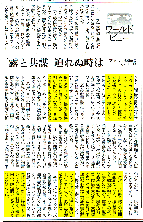 奴隷日報、もとい読売新聞に、久々にロシア疑惑がでていました。前回は、おかしな奴隷日報のFISAメモ報道ですね。毎回どんなウソ記事が現れるのだろうと楽しみに待っているのですが、最近は北朝鮮を叩いて「離島防衛」のためのミサイル購入やらを奴隷達に納得させるのに忙しく、なかなか報道できないようです。