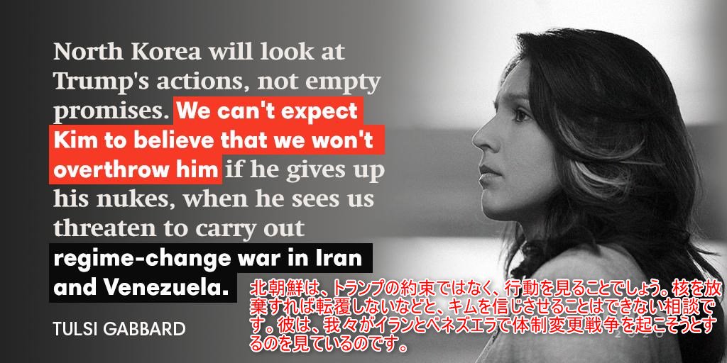そんな中で、一人だけ真実を言ってるのが、トゥルシー・ギャバードです。他の方でこれを表明する勇気のある方は見たことが無いんですが、誰かいますかね?山本太郎でもこんなこと言わないと思いますけど。