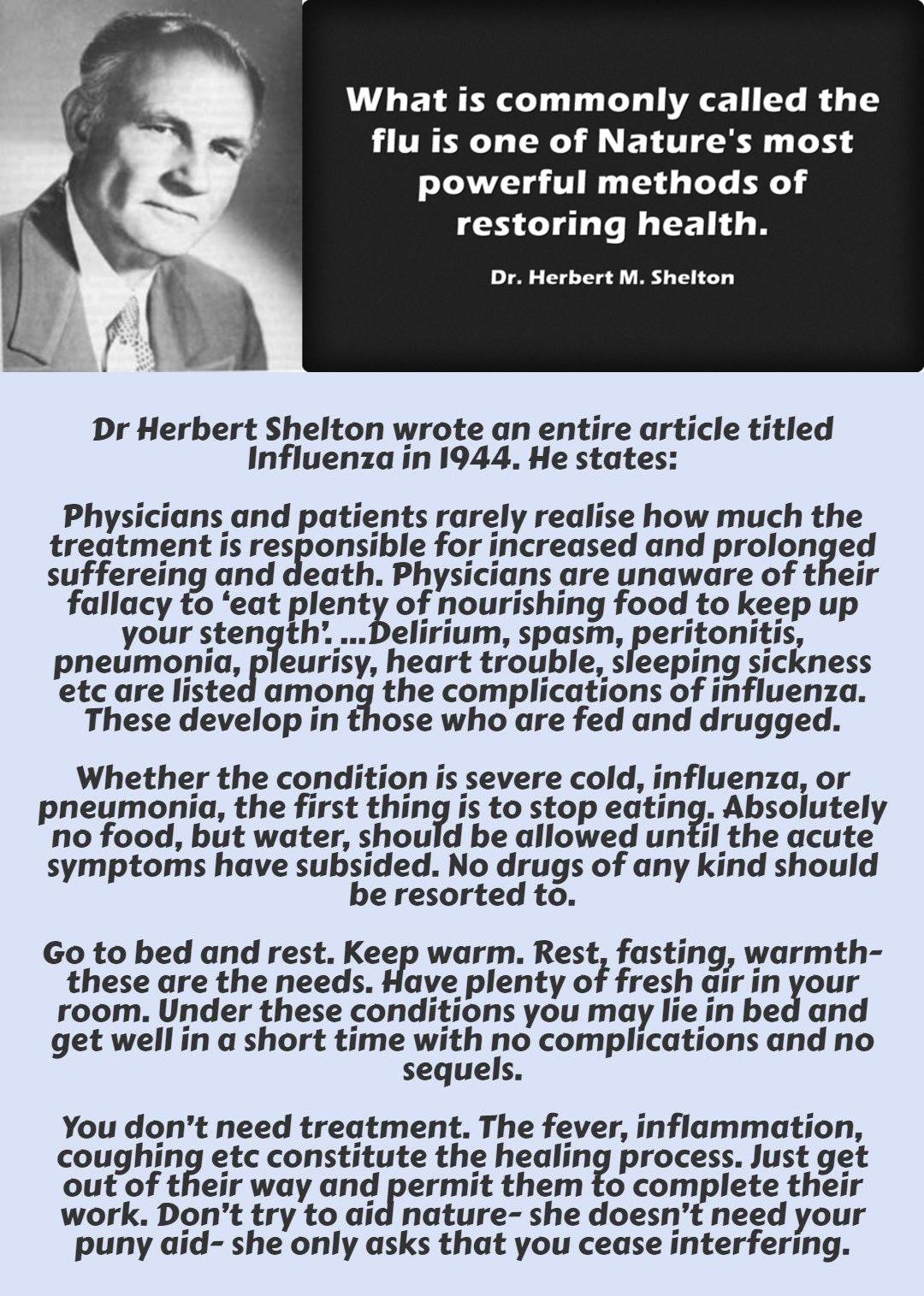 医師も患者も、ほとんど気づいていない、治療がいかに苦痛を増大させ、長引かせ、死に至らしめる原因となっているかを。医師は気づいていない、「栄養のあるものをたくさん食べて体力を維持しましょう」という誤りにだ。インフルエンザの合併症には、せん妄(意識混濁に加え、奇妙で脅迫的な思考や幻覚や錯覚)、痙攣、腹膜炎、肺炎、胸膜炎、心臓病、睡眠病などがある。これらの合併症は食事療法や薬物療法を受けた人に発症する。