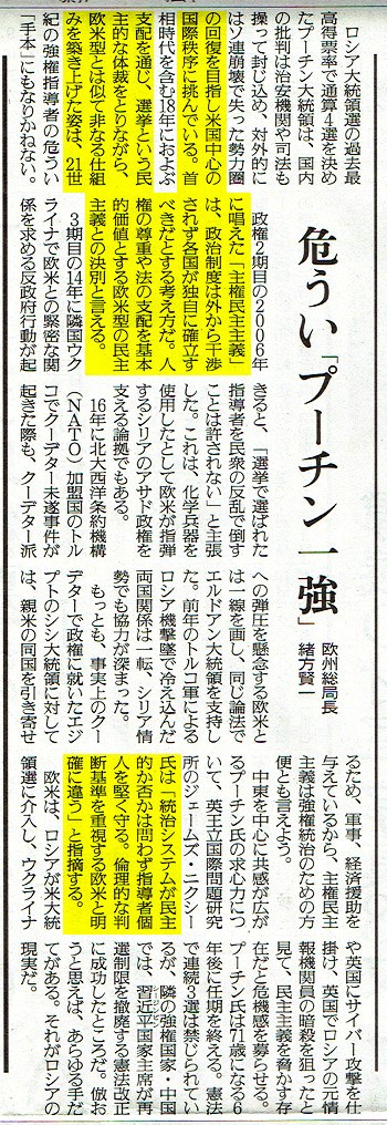 毎日毎日書くネタがありすぎて、どれを選べば良いのか迷ってしまう奴隷日報、もとい読売新聞です。どの記事を見てもツッコミどころが満載で笑わせてもらっています。プーチンの圧倒的勝利に際しても、憎まれ口を叩いていますね。まさに憎まれ口以上のものではなく、論説の類ではありません。こんな記事です。