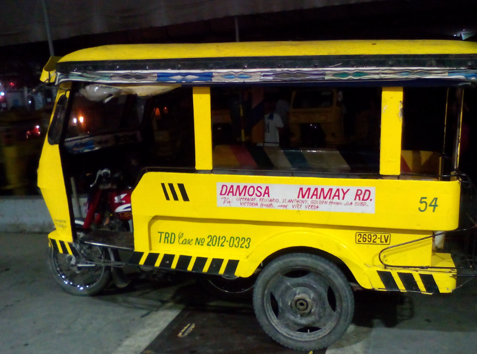 ショッピングセンターに行く途中で見かけた乗り物はこんなのです。トライシクルというバイクのサイドカーをさらに発展させた、日本じゃ完全に道交違反ものの乗り物です。ここではガイドがいないので乗りませんでしたが、タキュロン市でもっとスゴイのに乗ります。