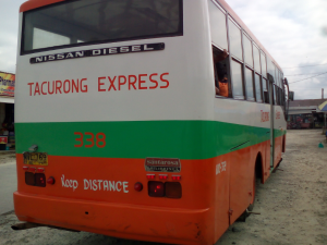ちなみに、後でわかったんですが、直行便はこれしかないが、途中のへネラル・サントス(現地人はジェンセンと言ってる)で乗り換えれば二つともクーラー付だったんです。こちらのはちゃんとTacurong Expressと書いてありますね。直行便です。