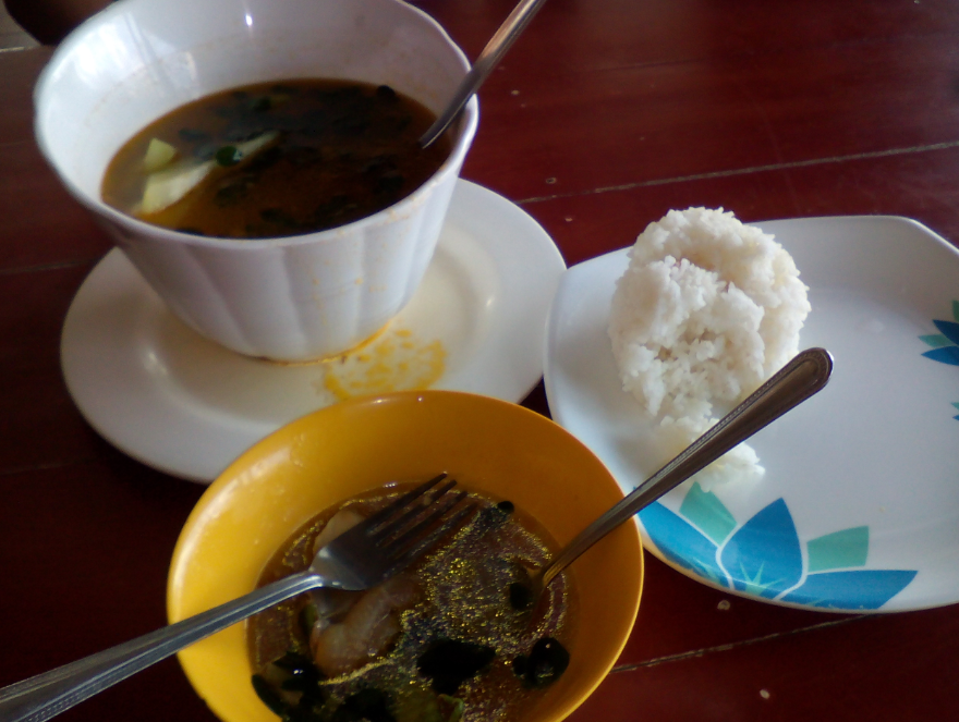 これは別の店で私のとった昼食。何だったか忘れましたが、後で聞いたらスープはモリンガ(マルンガイ)入りだとか。これには素晴らしい効能があることを後で知ったんですが。フィリピンではその辺に生えてる草みたいなもののようです。