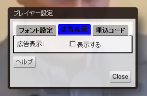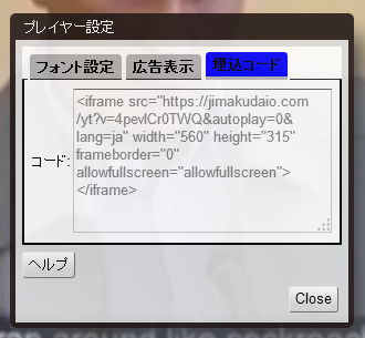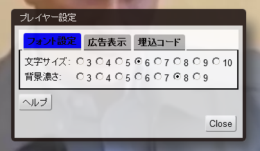 プレイヤー設定 2017.05.072018.01.13 この機能の使用にはログインが必要です。ログインしていない場合は、まずログイン画面が表示されます。 目次 フォント設定広告表示埋め込みコード フォント設定 字幕フォントのサイズと背景色の透過度を設定します。 広告表示 広告の表示・非表示を制御します。 ※これはメンバーの場合にのみ機能します。メンバーについてはこちらをご覧ください。 埋め込みコード 動画をウェブページに埋め込む際のコードが表示されます。