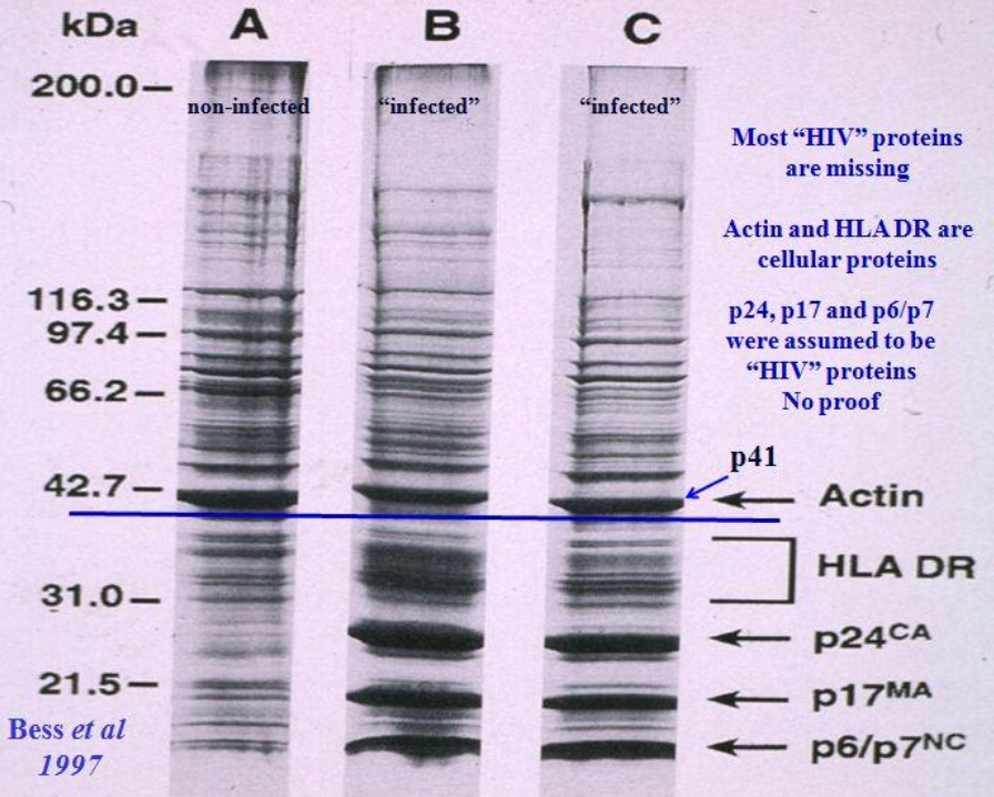 Bessらのゲル電気泳動は、HIVに特異的なタンパク質を検出しているという彼ら自身の主張を否定している。この論文の著者らは、この結果について何の説明もしておらず、その代わりにラジオイムノアッセイ法でタンパク質の相対濃度を分析した。その結論としては、「わずかなgp120SUが、HIV-1粒子よりもわずかに高い密度でバンドを形成するマイクロベシクルと関連している可能性があるとの証拠がある」である[36](強調は本論著者)。 このコメントは「HIV特異性」に関する別の問題を提起している。それは、彼ら自身の方法論でさえも、「HIVエンベロープ 」の一部であると主張するタンパク質が、想像上の「ウイルス」に「感染」していない細胞にも存在するという致命的な欠陥から目をそらすものであった[37]。