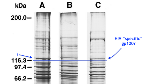 本小論、およびgp120がHIVに特異的であるという主張に関連して、Bessらの1997年のゲル電気泳動に戻り、120kDaのバンドを調べることは有益である。図2が明確に示すように、非感染細胞(A)、「感染」細胞(BとC)にかかわらず、3つのゲルのすべてが120kDa付近にバンドを示している。言い換えれば、彼らの実験によれば、gp120(あるいはこのサイズのタンパク質)が「HIV」に特異的であるという証拠はない。細胞性タンパク質としか言いようがない。