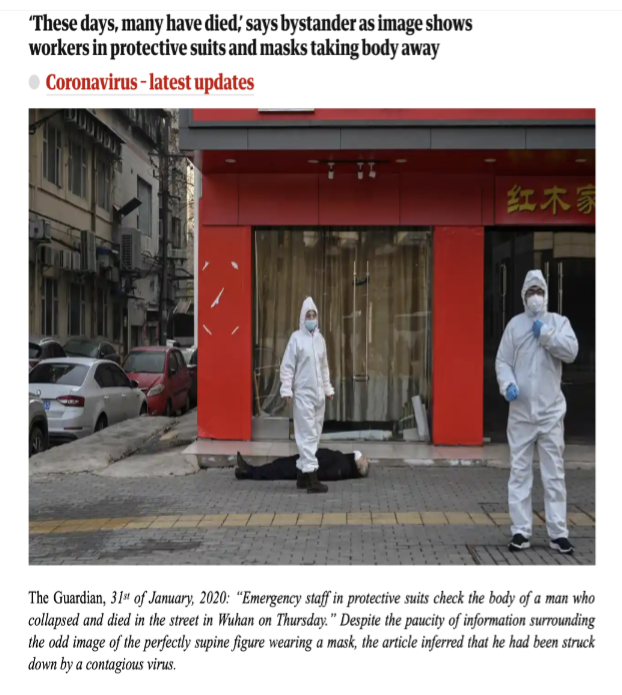 2019年末から2020年初めにかけ、中国都市の路上で倒れる人々だという画像や動画がネット上にあふれた。死傷者の中には中高年や若年層の姿もあり、新たな病気(後に「COVID-19」と命名される)は、人口のほとんどすべてを死に至らしめうると推測された。主流な「報道」は典型的に、病的な誇大広告とそれに対応する事実の少なさだった。例えば、2020年1月下旬、『ガーディアン』紙は「路上に横たわる男の死体:武漢コロナウイルス危機をとらえた画像」という見出しの記事を掲載した[41]。これは、武漢の状況を次のように描いている。