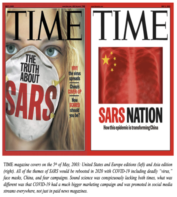 2020年まで早送りすると、「COVID-19」と呼ばれる新たな病気が発表された。これは、SARS-CoV-2によって引き起こされる「コロナウイルス病2019(Coronavirus disease 2019)」の略称である。結局のところ、この新型ウイルスはSARS-CoV-1に関連していると言われていた。当然ながら、これが2020年にパニックを引き起こし、助長したのである。2002年から2004年にかけてのSARS「流行」の公式死亡率が11%だったからだ。再び被害が拡大し、COVID-19は永遠にSARSと結び付けられることになった。大衆は目に見えない脅威を信じるように騙され、切迫したロックダウンに備えさせられた(本書第4章の「SARS-2(COVID-19)はなぜSARS-1より大きかったのか」も参照のこと)。