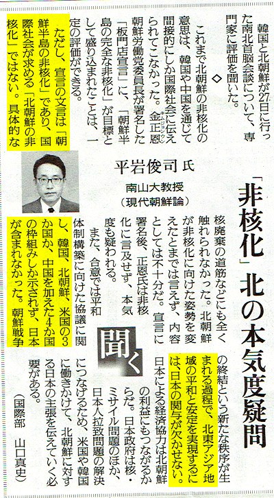 この論説も、はなから矛盾に満ちています。タイトルは「『非核化』北の本気度疑問」としているにも関わらず、「宣言の文言は『朝鮮半島の非核化』であり、『北朝鮮の非核化』ではない」んだそうです。ここ断定してますよね。