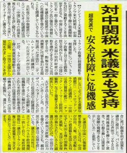 「対中関税 米議会も支持 超党派で 安全保障に危機感」です。私の言ってきた通りですよね?