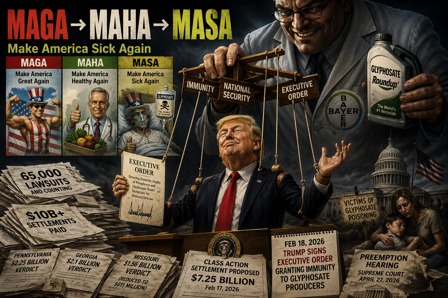 • トランプは2026年2月18日、軍事重要物資である「単体リン」の生産保護を名目にした大統領令に署名し、グリホサートに軍事用途は一切ないにもかかわらず、国防生産法を悪用してバイエルへの訴訟免責を同時に付与した。