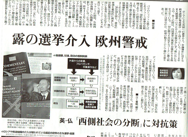 長いので概要だけですが、要するにロシアのサイバー攻撃やら、RT(ロシア・トゥデイ)によるプロパガンダ攻撃を報告してますが、結局のところ、フランスやらNATOのその種の組織からの伝聞に過ぎません。また、「ロシアや関連組織の介入が疑われている最近の欧米の主な選挙・投票」などという表まで作ってますが、当然のことながらその証拠については何の言及もされていません。「疑われている」と逃げ道を作っておけば、何書いてもいいと思っているようですね。奴隷日報、もとい読売新聞というのは、どうもそのような編集方針みたいです。それでいて「ロシアの狙いはどこにあるのか」などと、あたかも確定事柄であるかのような前提で勝手に話を進めてしまいます