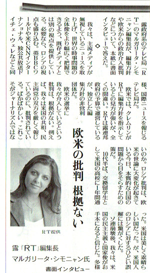 驚いたことに、読売にはフェアなところもありました。その記事の左側を見てみると、我らがRTの編集長マルガリータ・シモニャンのインタビューを載せているではありませんか。