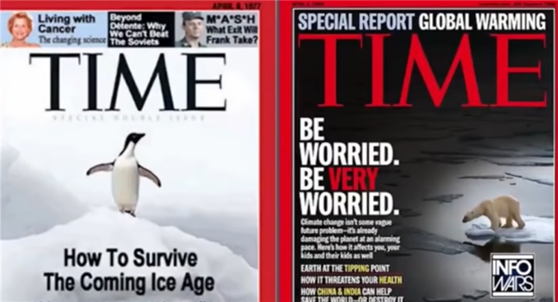 最初に戻って言いましょう。地球温暖化が何年も推進されてきましたが、何かしら地球を破壊するといった。全員を殺すと。そして、わかったことは、15年ほど温暖化は起こっていないということです。連中は恐怖話を気候変動に変えました。ところで、1970年代に戻ってみれば、その当時は、TIME誌の表紙では、「迫り来る氷河時代をどう生き残るか」ですよ。