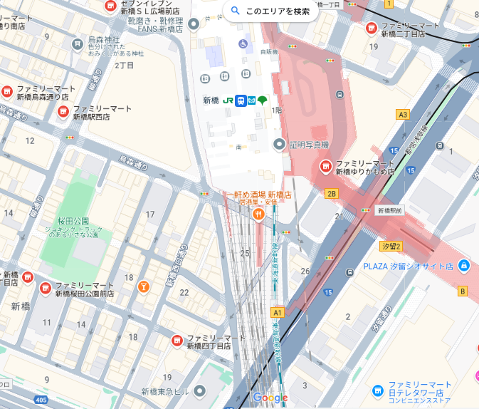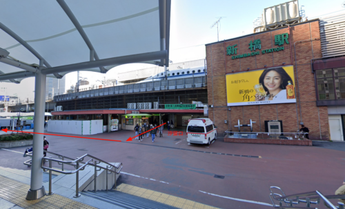 JR新橋駅の汐留口(しおどめぐち)から出てきます。手前側はゆりかもめ乗り場です。