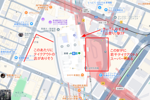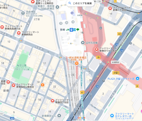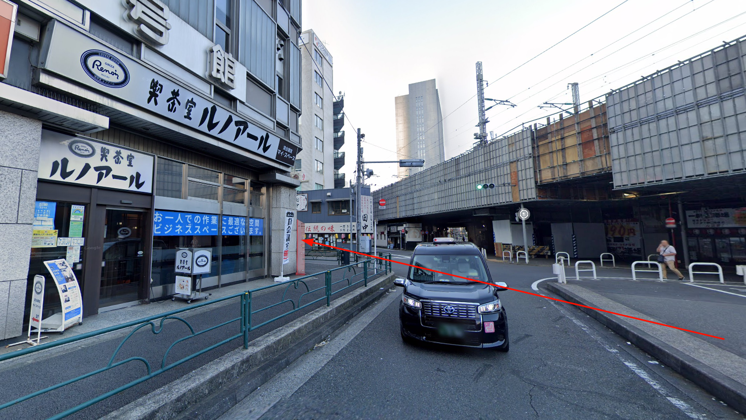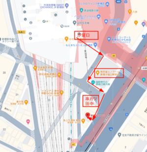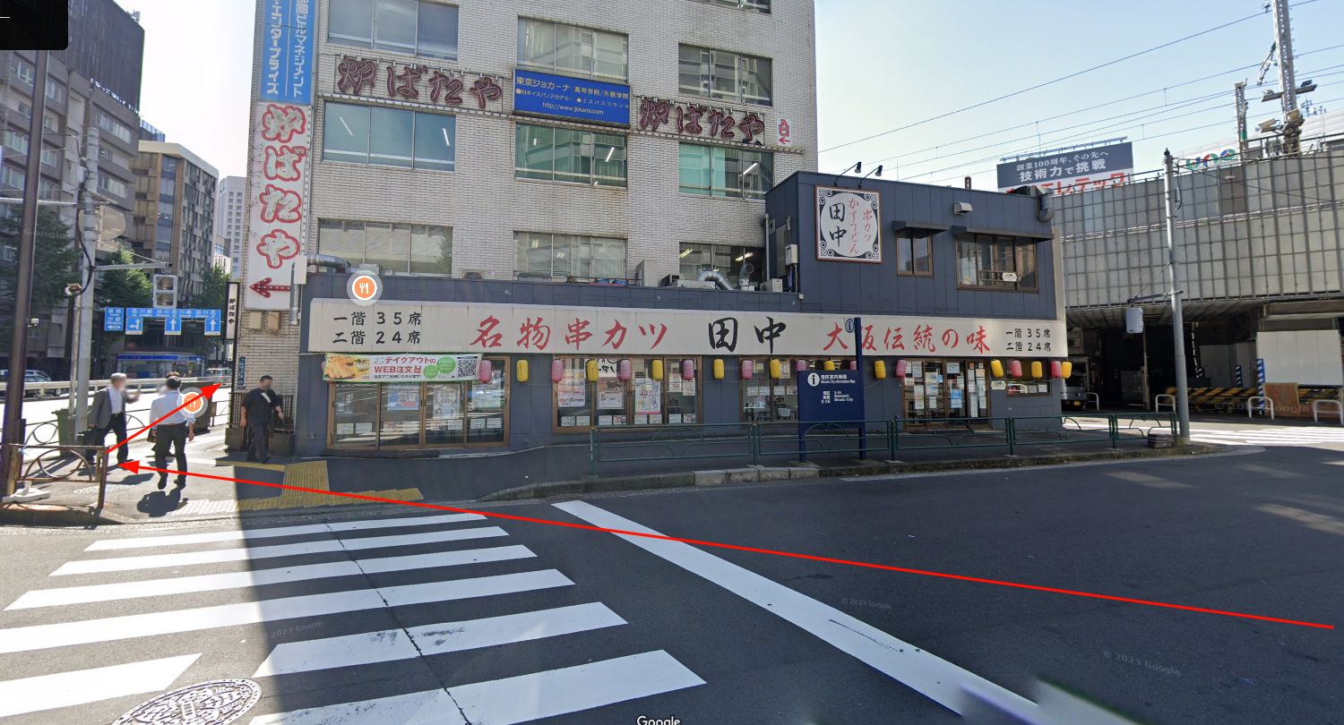 ルノアール(新橋汐留口駅前店)が見え、その先に串カツ田中(新橋駅前店)があります。