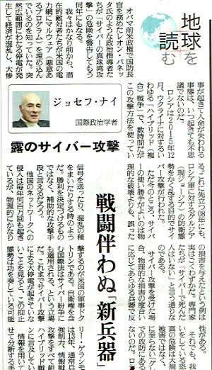 ところで、本日もまた奴隷日報、もとい読売には国民洗脳のための論説が掲載されておりましたよ。読売によるマルガリータインタビューで書いたことに引き続き、何度も何度もしつこい位にロシアの恐ろしさを徹底的に叩き込もうとあらゆる方策をしています。。。と言いますか、そもそも彼らが仕える御主人様であるところの、いわゆるジャパンハンドラーズであるジョセフ・ナイ氏の登場であります。もちろん、どういうわけかしょっちゅう登場しますけれども、今回はロシアに的を絞っておりますね。あまりに長いので一部です。どうかゴミ売新聞買って読んでください。