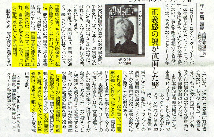 さて、オマケのようで何なのですが、本日もまた、今をときめく国際政治学研究者三浦瑠麗先生による、なんとヒラリー・クリントン著書「What Happened」の書評が掲載されていました。ご笑覧いただきたいと思います。