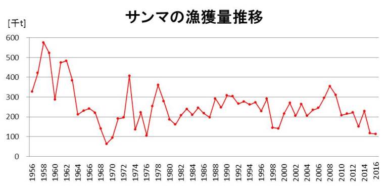 今日も飯時にチラとみていると、サンマが不漁だ不漁だとのたまわっているんですが、どうもそのグラフとしては、ここ数年のものしか示されないんですね。それ以前のものがわからないわけです。