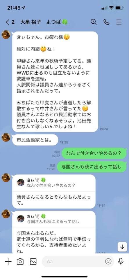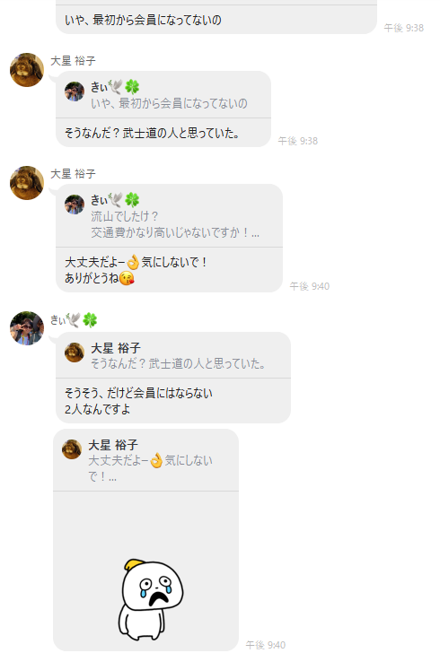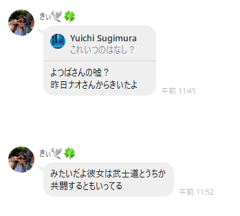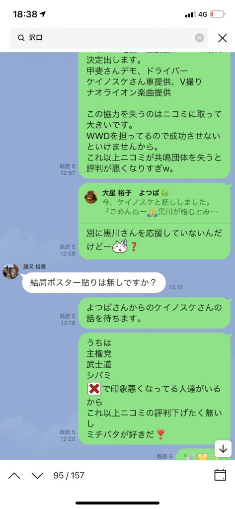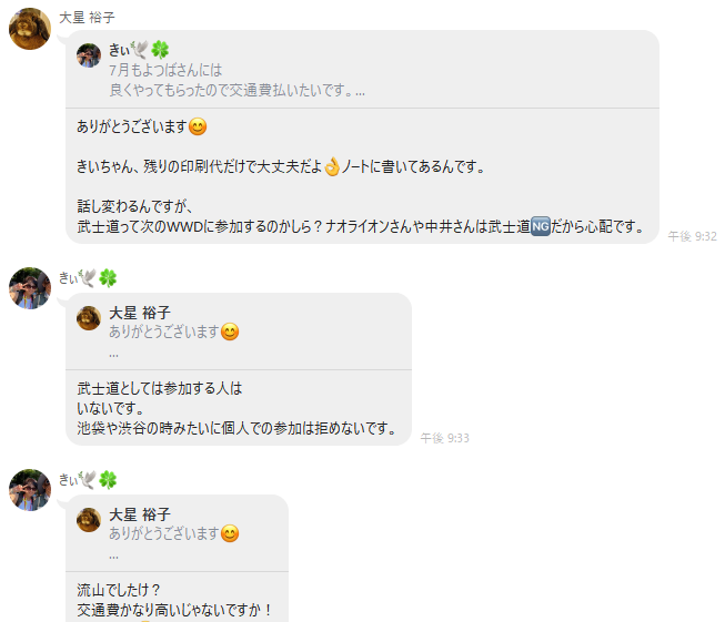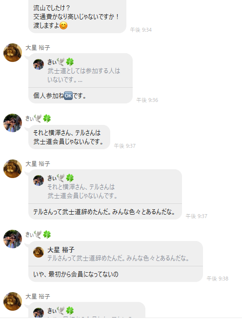 また、8/6にはニコミLINEにて、他メンバーもいる中で以下の会話を交わしているのである。武士道との共闘など一言も話してはいない。