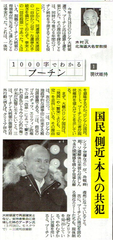 そして「国民・エリート・プーチンの三者が現状維持を望んだことを示している」んだそうです。プーチンがどういった政策を掲げたのか知りませんけど、「プーチンが勝った=現状維持」とは言えませんね。ここがまず決めつけかと思いますが、これを前提として、この方は論を進めていきます。