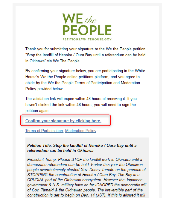 あ、それで署名の仕方としては、名前とメアドを入れると、メールが来るので、後は来たメールの中の「Confirm your…」の部分をクリックするだけです。簡単です。