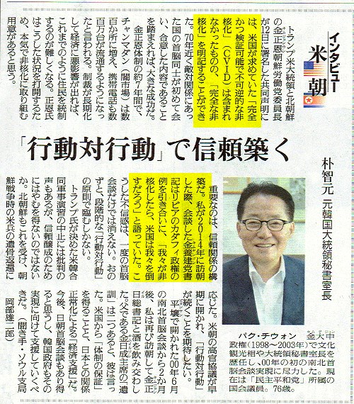 元韓国大統領秘書室長のパク・チウォンさんなんですが、最初の「米国が求めていた。。。は含まれなかったものの、『完全な非核化』を明記することはできた」という点は、やはりストーリー通り、合意された朝鮮半島ではなく、北朝鮮の非核化のように読めるようにはなっています。