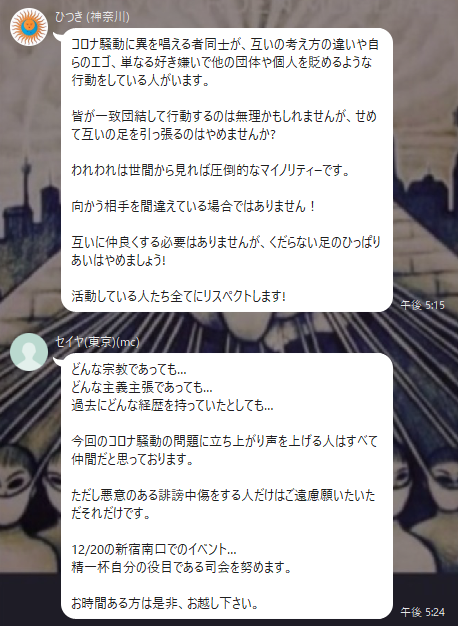 両者は、それぞれの歪んだ願望実現のためにタッグを組み、私を組み伏せようとしました。そもそも前者は自らの力で他者を論破する自信の無い弱虫の卑怯者であるがために、無関係な後者を勝手に引き入れました。LINEグループに勝手に乱入した後者が、いつもながらの「上滑りの口先」で私をねじ伏せようとしたのです。
