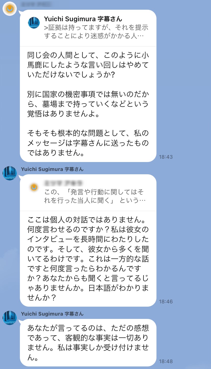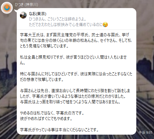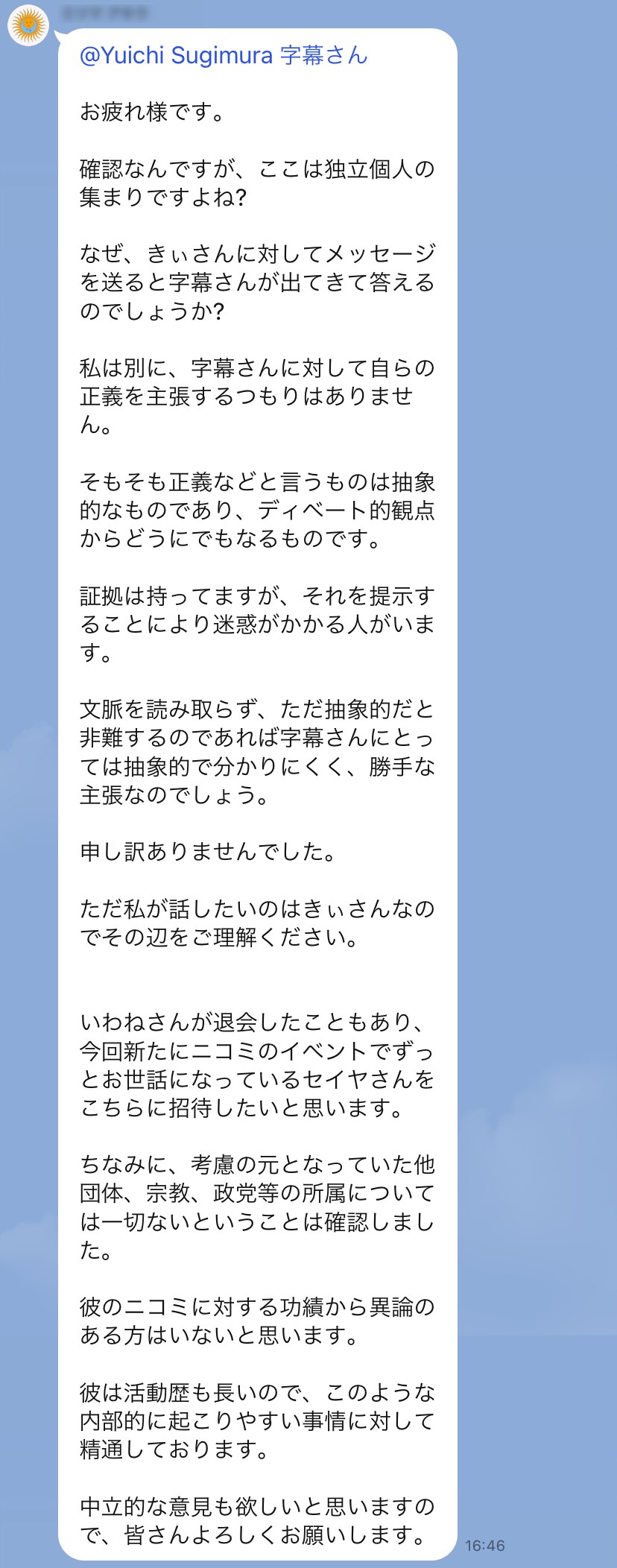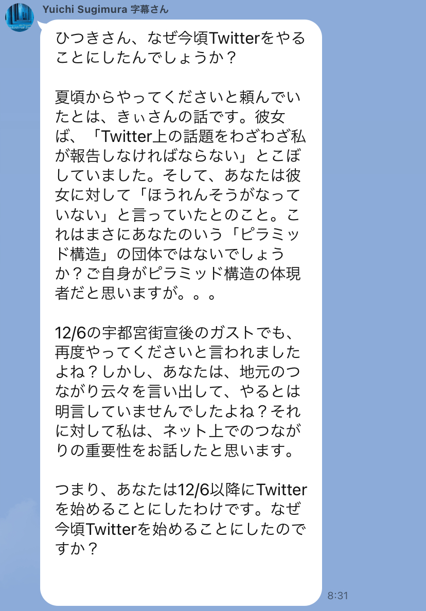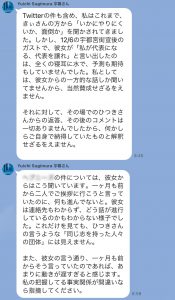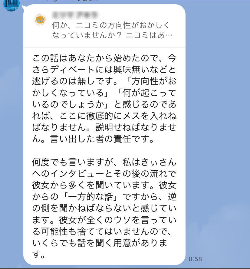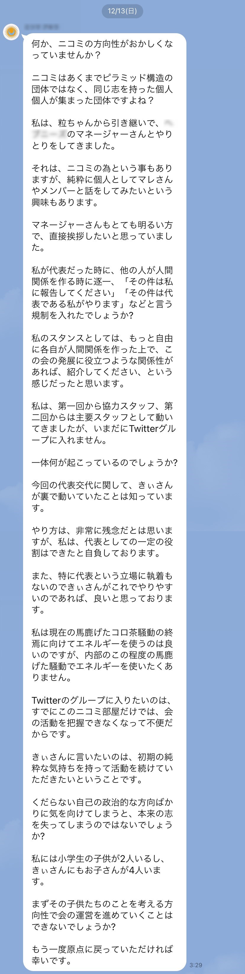 12/14日のことです。ひつき氏がニコミLINEにこんなことを書いてきました。これも長く、この件とは別の問題についても触れていますが、本題に無関係なので解説はしません。