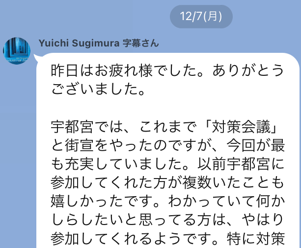 その後、私はニコミ会と共同開催という形で、12/6の宇都宮街宣を行いましたが、最初ひつき氏は「そんな地方都市でやっても」と否定的な見解でした。しかし、なぜか二日前になって突然参加すると言い出し、実際に現地にやってきました。