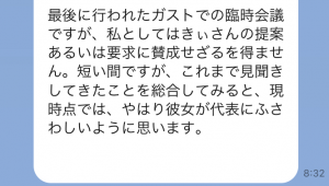 その夜のガストでのことですが、「メンバーが集まってるのだから会議をしよう」と言い出したのは、当のひつき氏です。そして、彼はこの場できぃ氏に「最近報告が無いよね」と言ったのです。彼女は既にひつき氏に逐一報告するのをやめていました。
