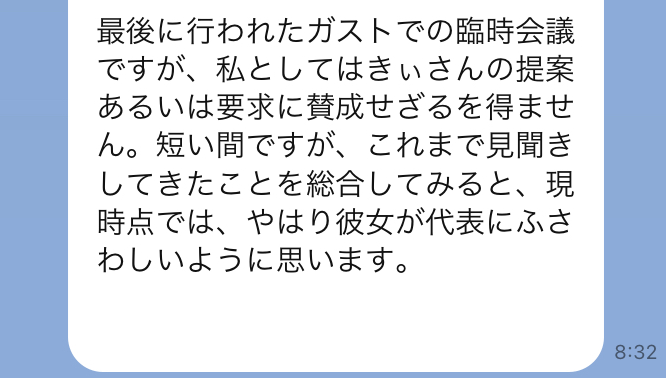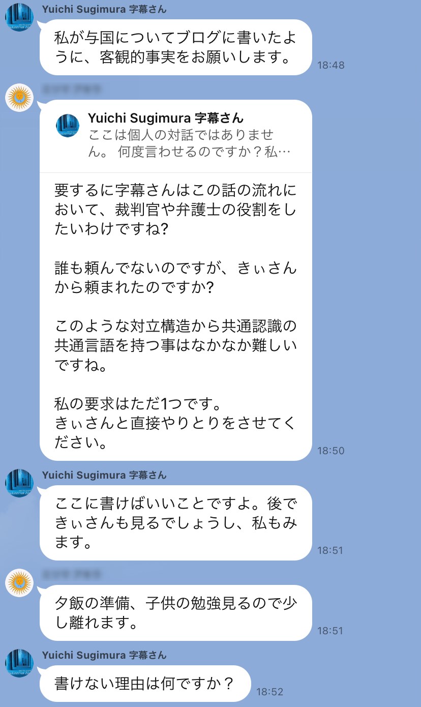 何かしらの証拠があると彼は主張するのですが、グループLINEにそれを出せません。ひたすら、きぃ氏を出せと言ってます。しかし、私はきぃ氏に一切出てきてほしくないと言ってありました。当然ですが、私はひつき氏からの事実関係を知りたいわけですから、きぃ氏はかえって邪魔になります。
