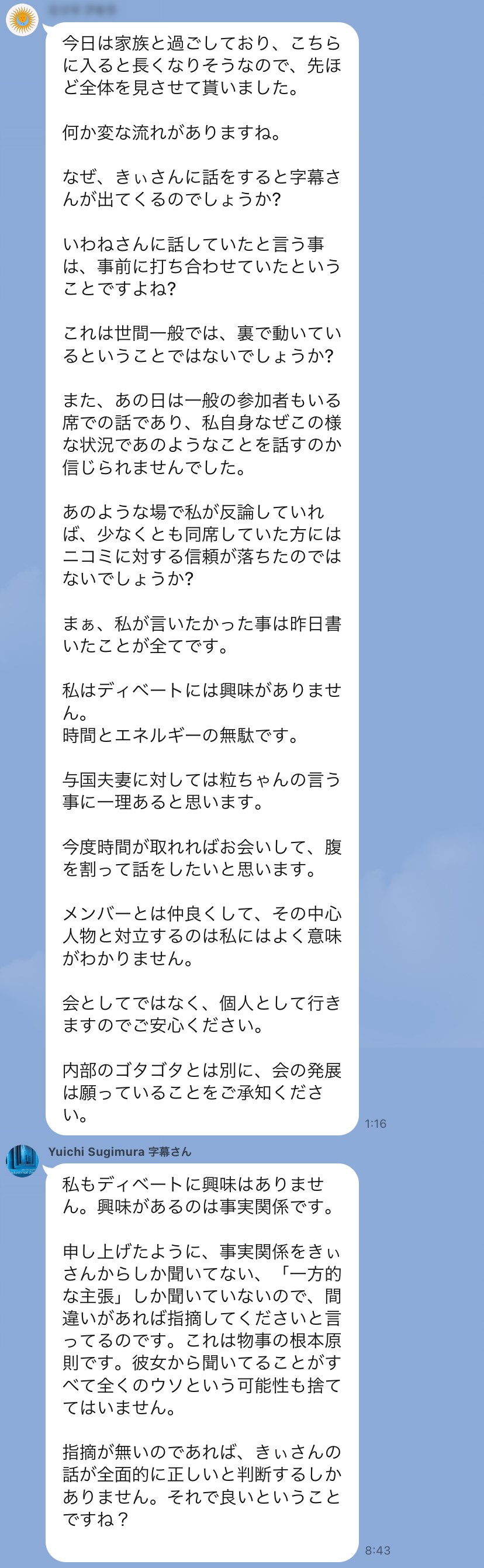 何かしら「ニコミ会が変な方向性になっている」「ピラミッド構造になっている」、さらには後に「きぃ氏が裏で画策していた」証拠があるというのですが、「迷惑のかかる方もいるので」出せないのだそうです。私は何度も「事実を知りたい」と言っているにも関わらずです。