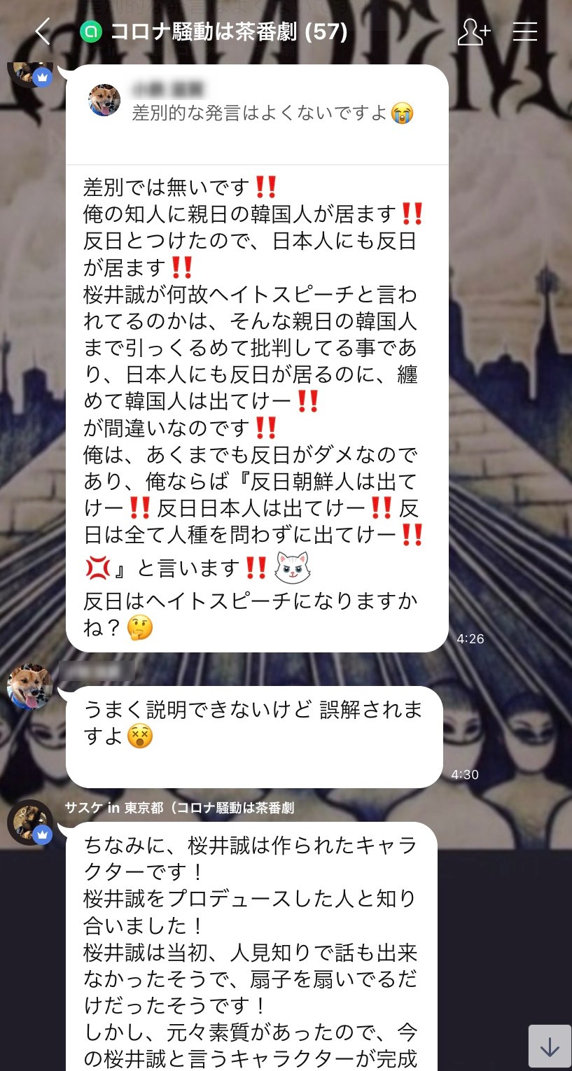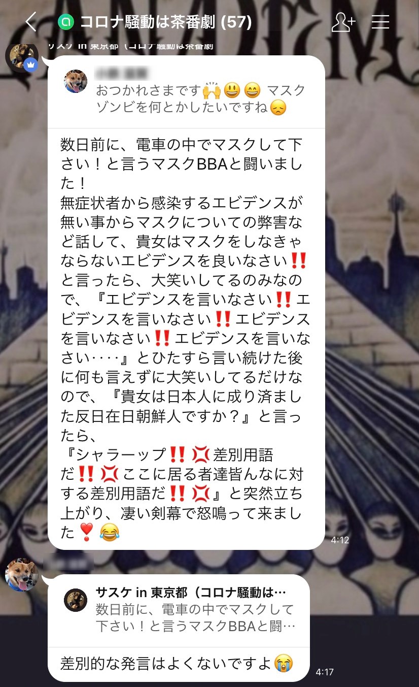「真実を隠すデモ」の顔サスケをご紹介します。 未分類 2020.12.192020.12.20 ※武士道の記事一覧が/tag/武士道にあります。 これが武士道主催の12/20「真実を隠すデモ」の顔であるサスケの本質です。このような人物と行動を共にし、その行動をかばっているのが粒あんであり、両者を武士道という団体の顔としているのが与国秀行・真澄夫妻です。 いつまでこういう人達とつきあう気でしょうか?これがまっとうな人間の言動に見えますか?このような人物がいれば、新生活様式反対等の運動全体にも水をさすことになります。 皆さん立ち止まって、ちゃんと考えてみてください。本当にお願いします。