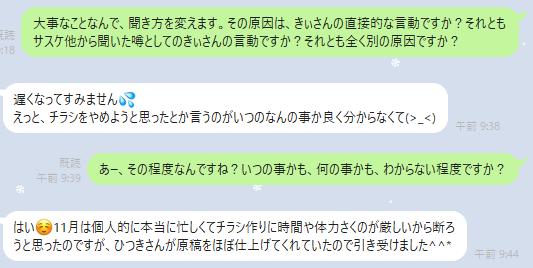 彼はこう言います、「チラシ作りも、Sさんがきぃちゃんのことが嫌で頓挫しそうになりました」(Sさんは、ニコミ会のチラシ作りの協力者です)。この件については、ひつき氏の上の話を読んだ後に、私がSさんに直接聞いてみました(11月前半の「事件」の当時も、私はSさんとは連絡をとっていました)。