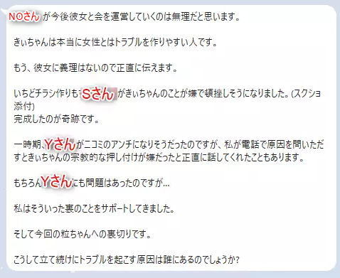 ひつき氏は「Yさんがニコミのアンチになりそうだったのですが、私が電話で原因を問いただすときぃちゃんの宗教的な押し付けが嫌だったと正直に話してくれたこともあります」などと書いてます。宗教的な押し付けと曖昧な言い方をしていますが、Yさんの直接の言はこうです。