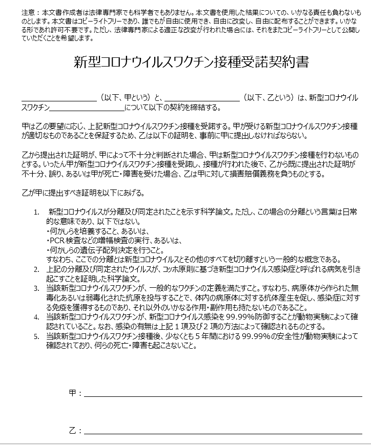 いよいよ、イカサマな新型コロナウイルスワクチン接種が日本でも開始されています。職場などで半ば強制されるケースもあるかもしれません。そういったケースを想定して作成した契約書です。