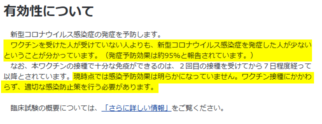 一番最初の「SARS-CoV-2による感染症の予防ができると考えられています」には、何の具体的な数字も根拠もなく、その後で「感染予防効果は明らかになっていません」とひっくり返しているにも関わらず、ここではいやに具体的な95という数字を出してきています。