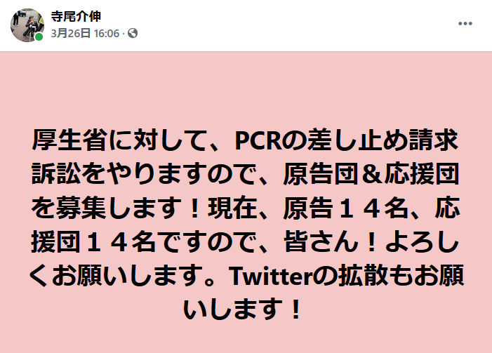 厚生省に対して、PCR検査の差し止め請求の訴訟をやりますので、参加される皆さん、よろしくお願いします。