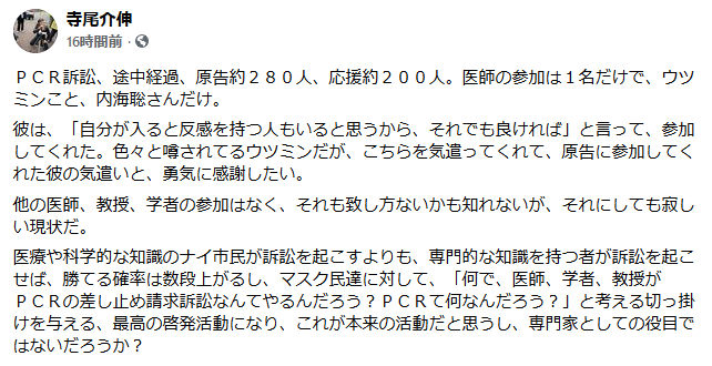 名古屋の寺尾介伸(ゆきのぶ)さんによる、厚労省に対するPCR検査差し止め請求訴訟です。彼はfacebookとYouTubeしかやらないようで、特にfacebookをやらない人にとっては情報がどこにあるのかわかりづらいので、ここにまとめておきます。