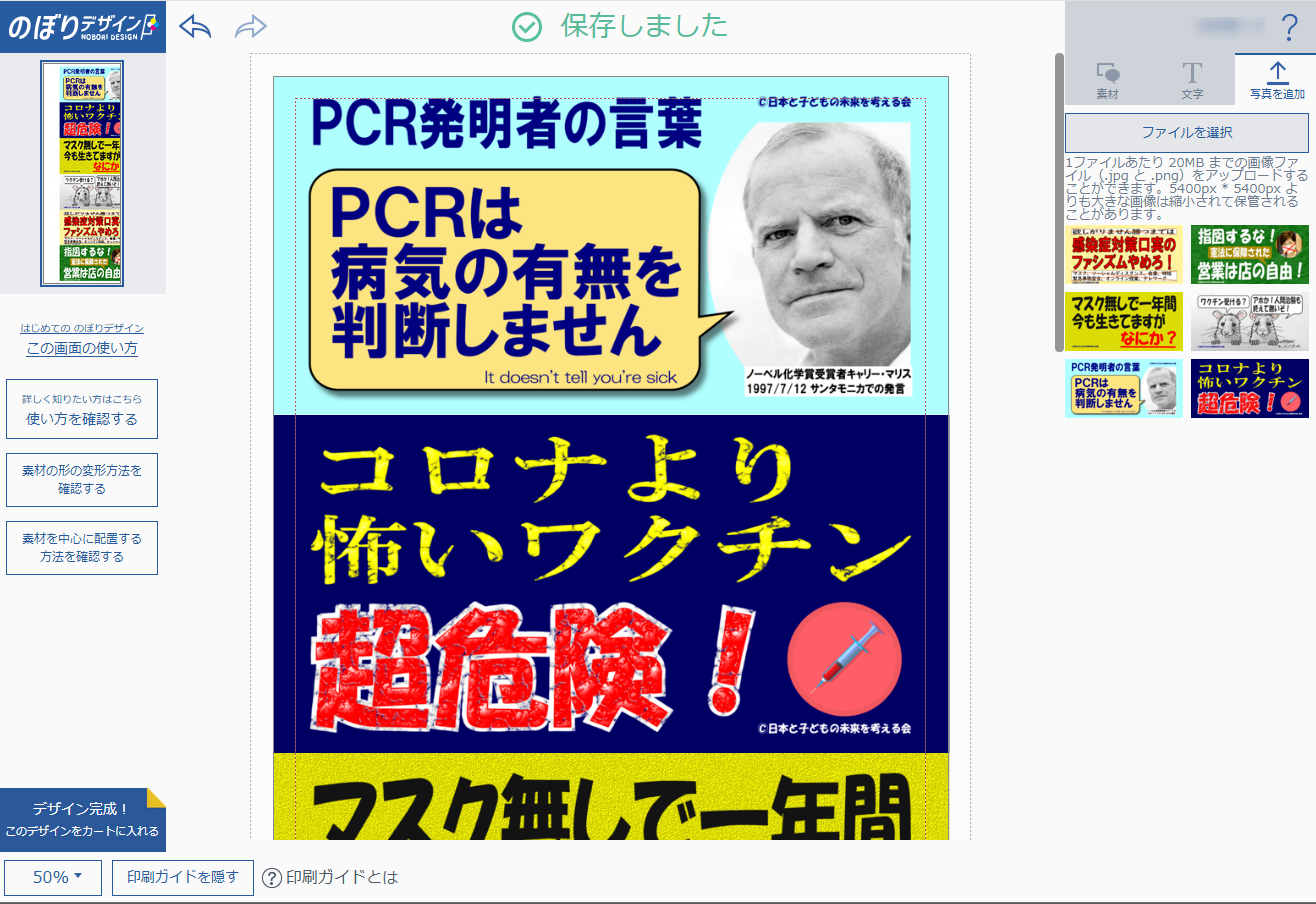 これらのPNG画像を作成しておき、先の「ジャンボのぼり」の注文において、「WEB上でデザイン制作プランで注文する」を選択します。あとは、デザイン編集画面でPNG画像を貼り付けて行くだけです。