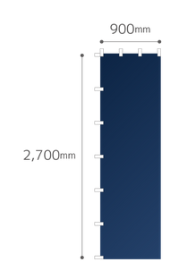 横90cm×縦270cmの縦長の「のぼり旗」です。なお、「チチ」と呼ばれる棒を通す輪っか(上側と左側にある)は不要なので注文時オプションでOFFにします。