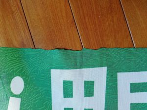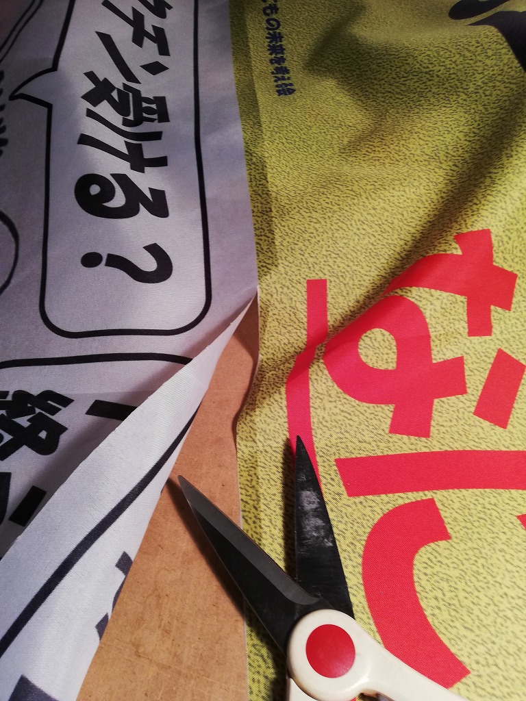 この縦長のジャンボサイズののぼり旗を縦方向に6分割し、横90cm×縦45cmのプラカードを6つ作るわけです。