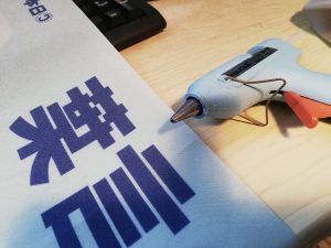 あとは、旧ロールプラカードと同様に、棒にホットグルーガンでつけます。こんなやつです。