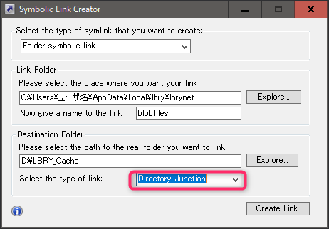上のように設定して、「Create Link」をクリックします。タイプを必ずDirectory Junctionにすること。